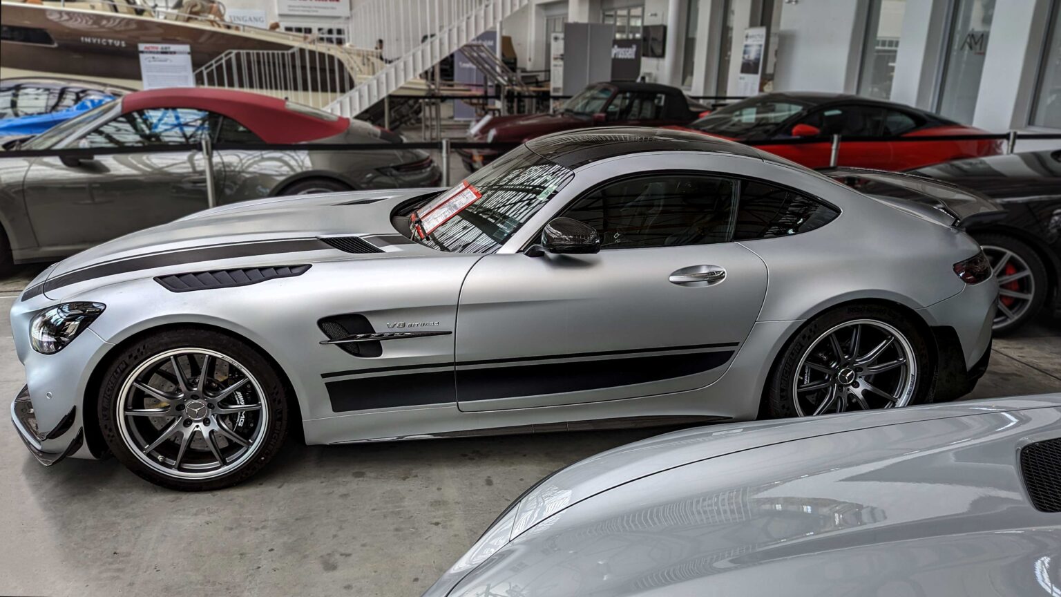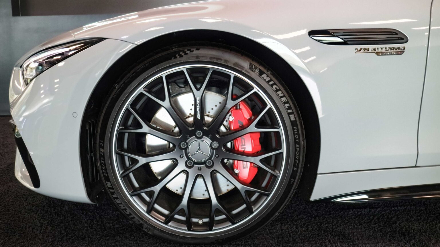 The AMG GT Coupé (C192, 2023–) uses the 4.0-liter twin-turbo V8 with 4MATIC+ all-wheel drive. The AMG GT63 delivers 585 hp, 800 Nm, and 0–100 km/h in 3.2 s, combining race-level performance with daily use.