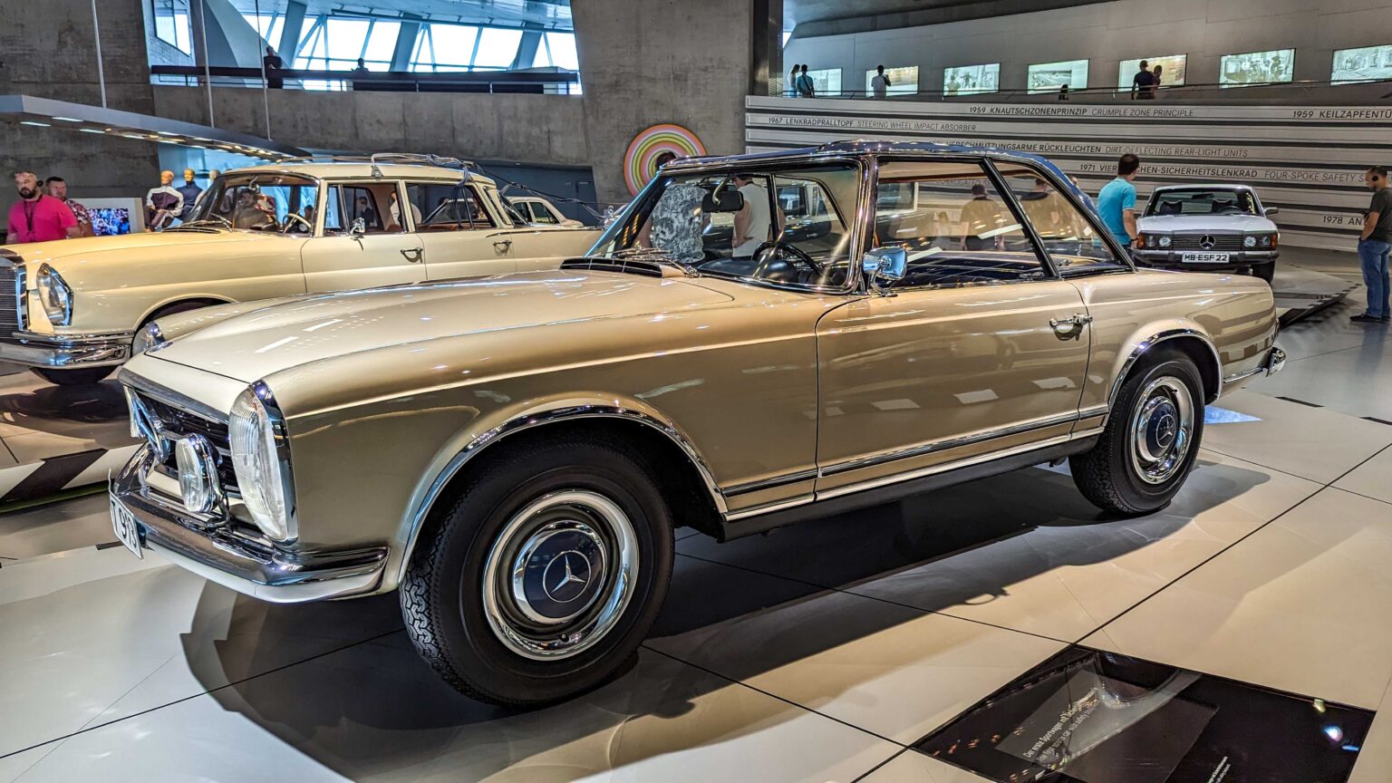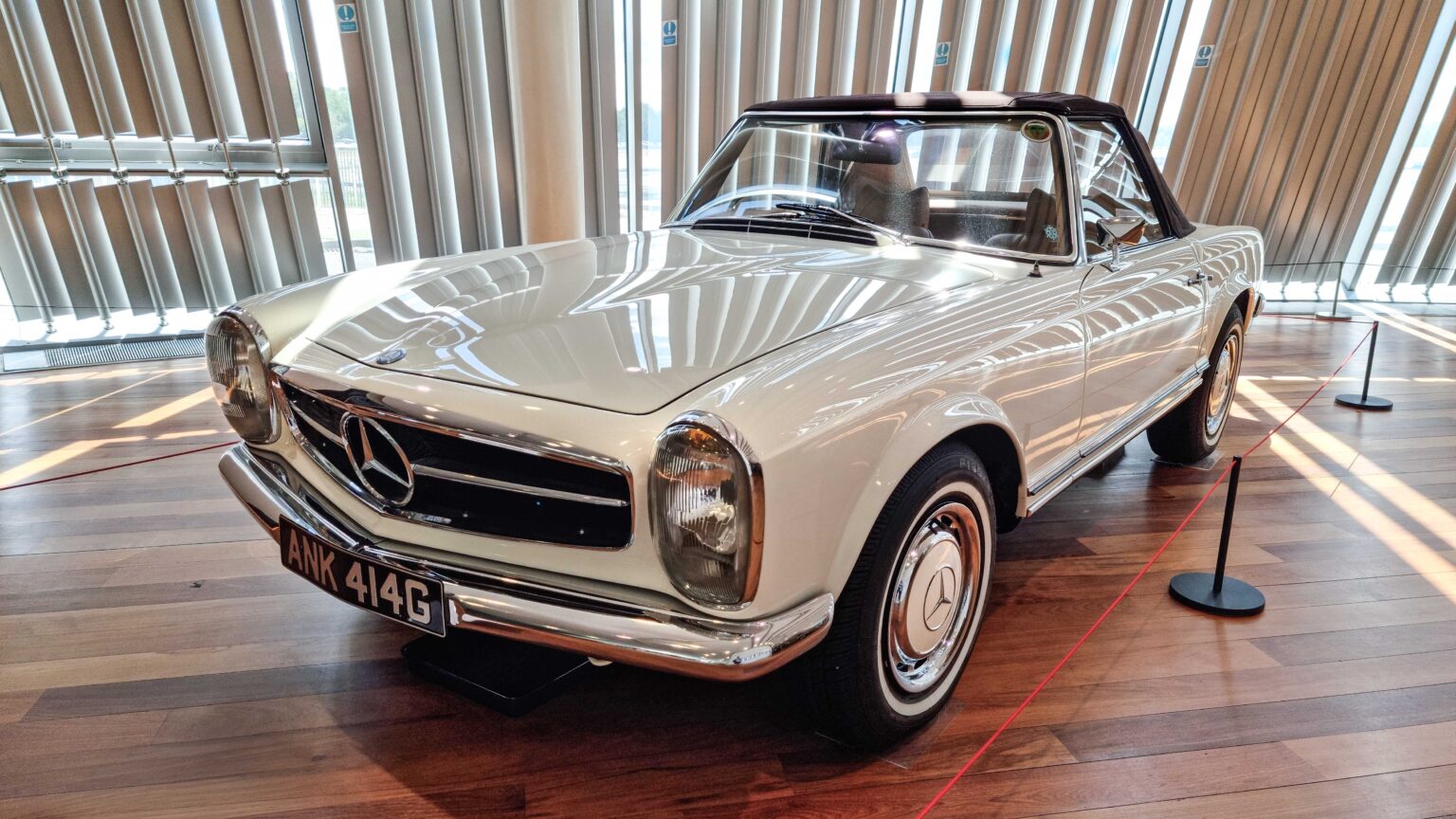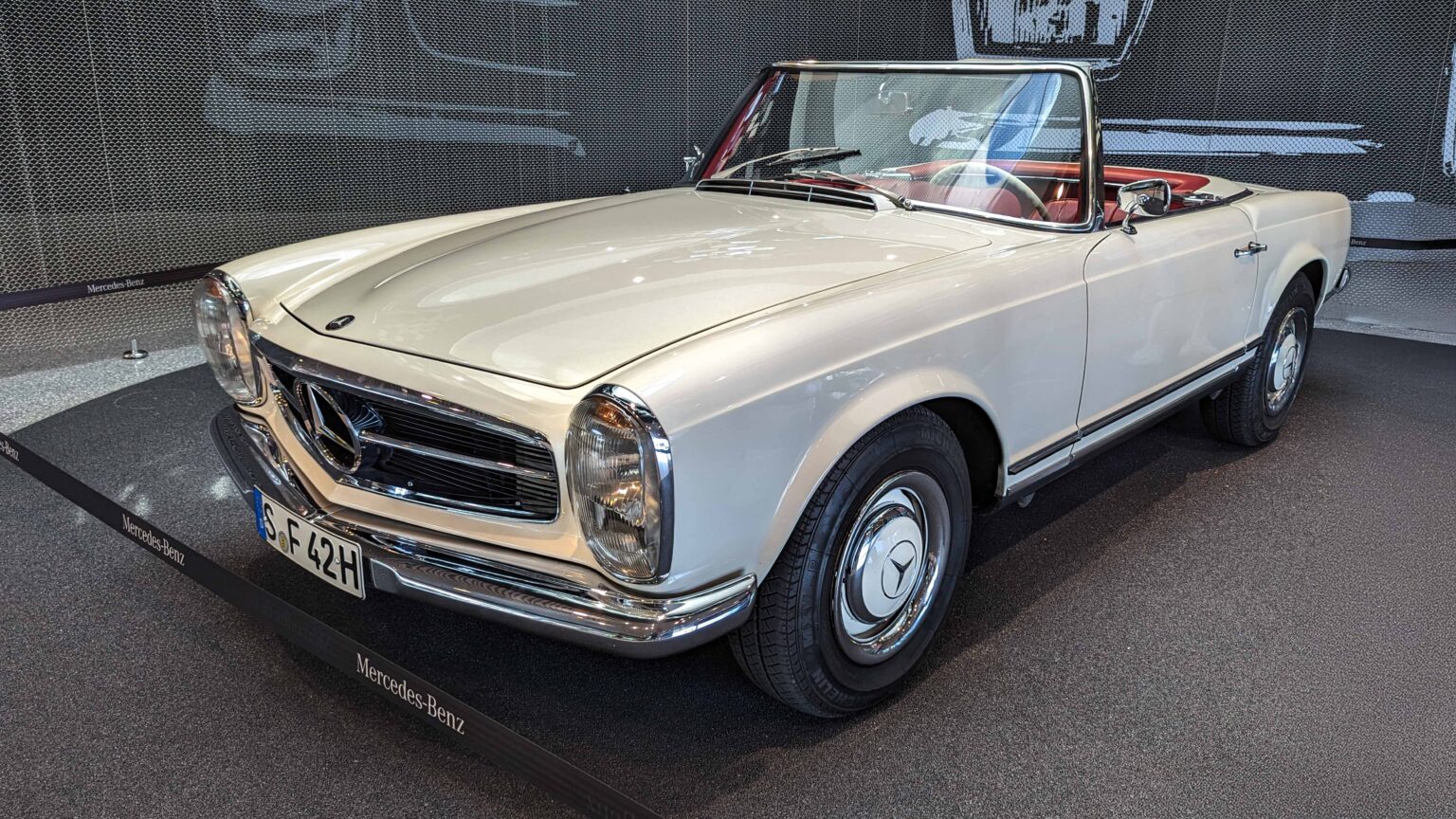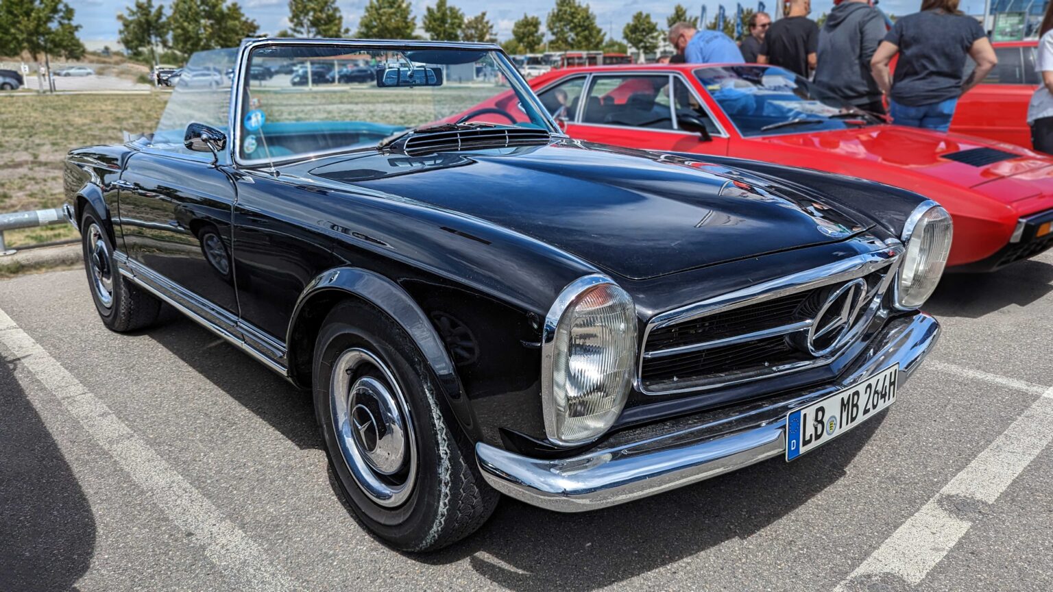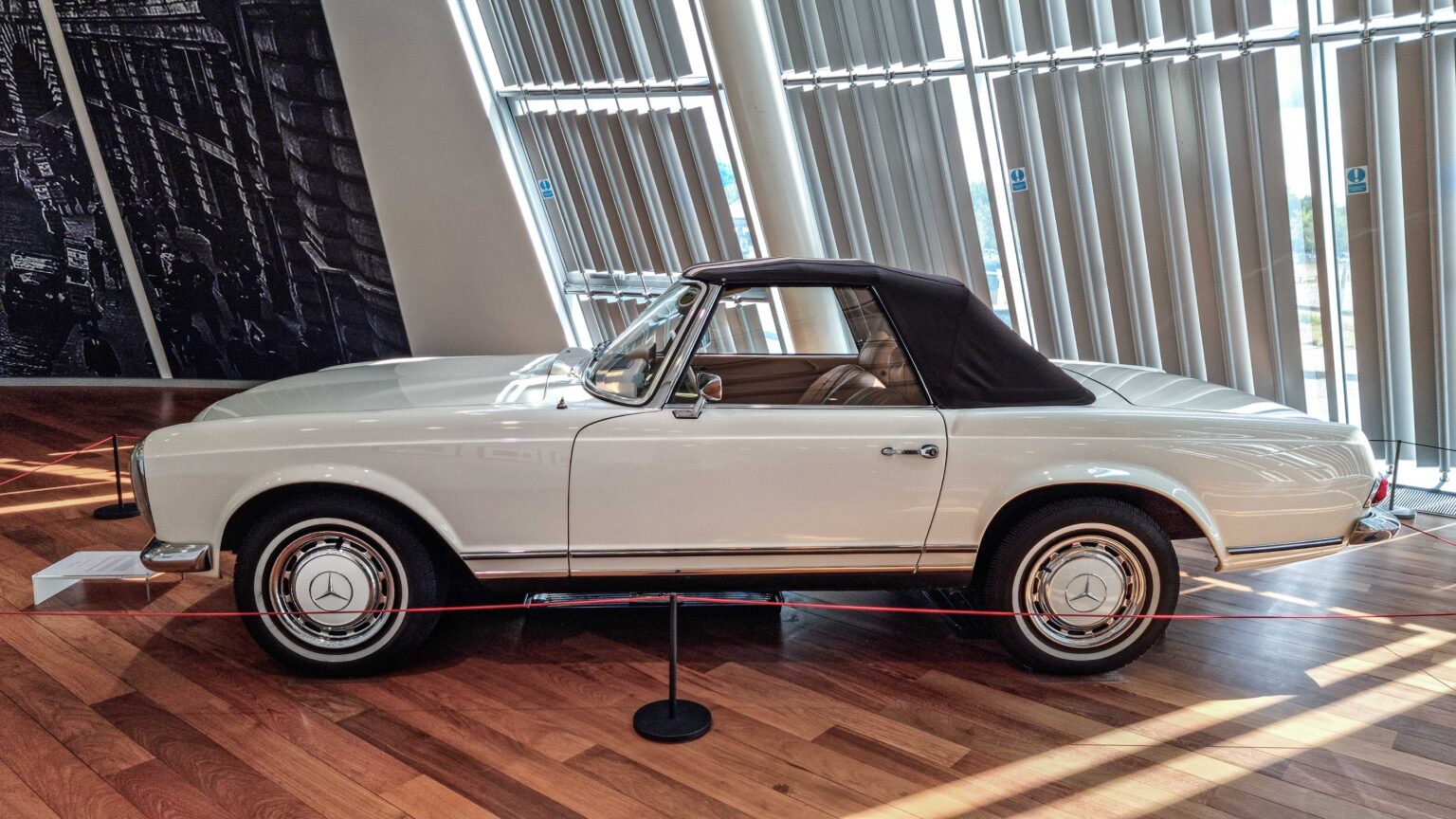 The Mercedes-Benz SL W113 “Pagoda” (1963–1971) is famed for its elegant design and concave hardtop roof. Offered as 230 SL, 250 SL, and 280 SL with up to 170 hp, it remains one of the most desirable classic Mercedes roadsters.
