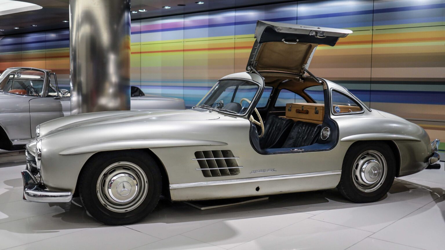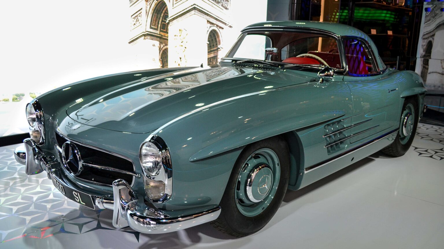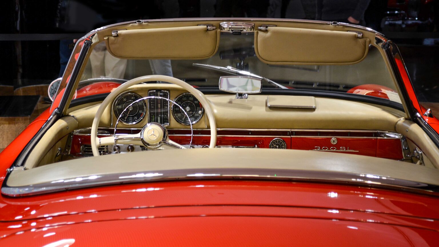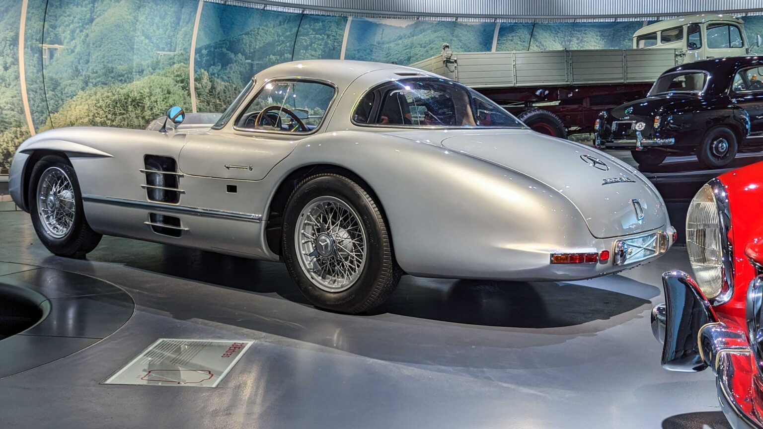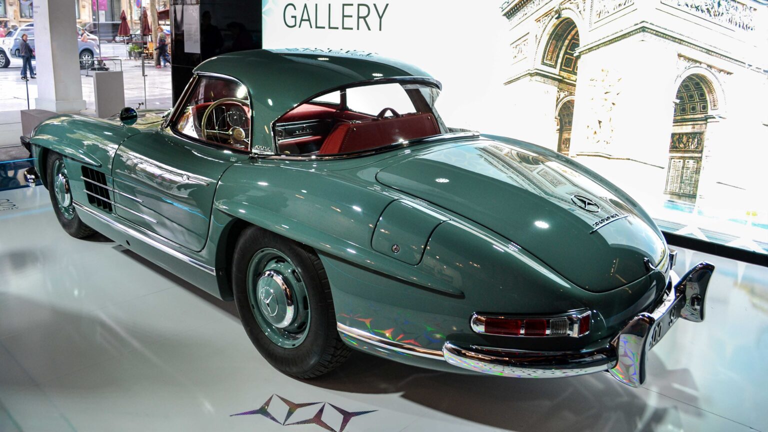 The 300 SL Gullwing (1954–1957) became an instant legend with its iconic upward-opening doors. Powered by a 3.0-liter inline-six with 215 hp, it was the fastest production car of its time and remains one of the most collectible Mercedes ever.