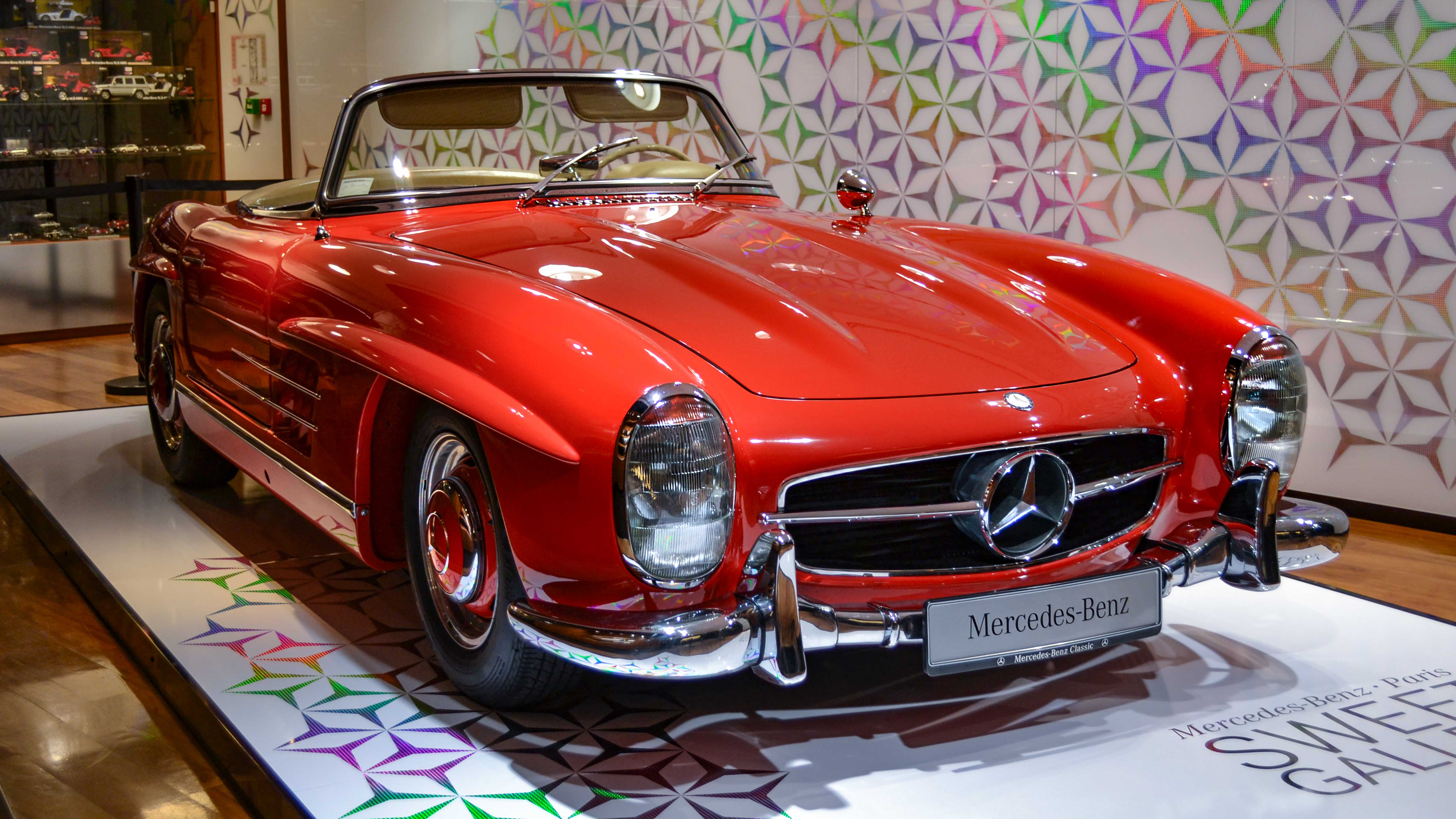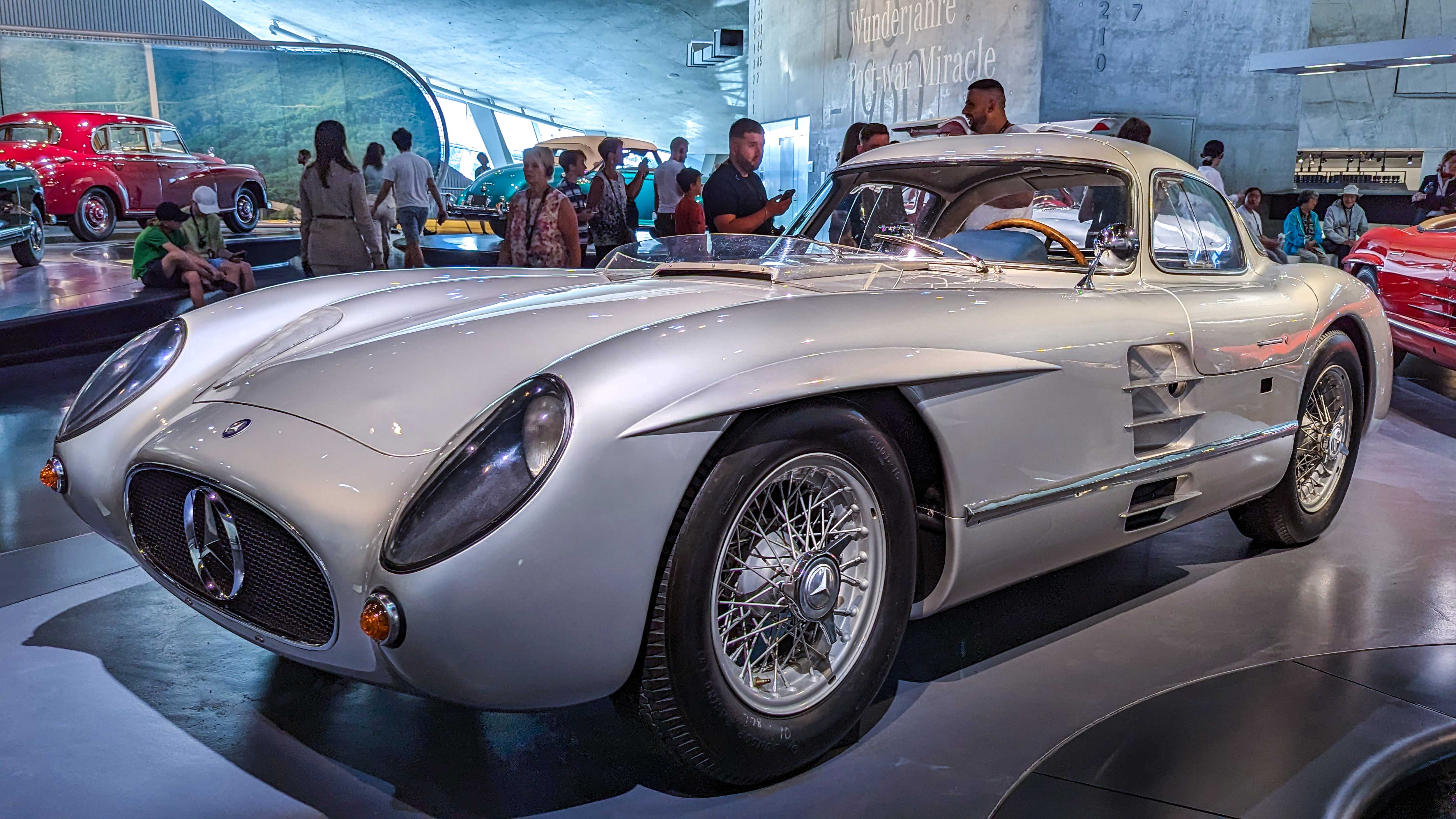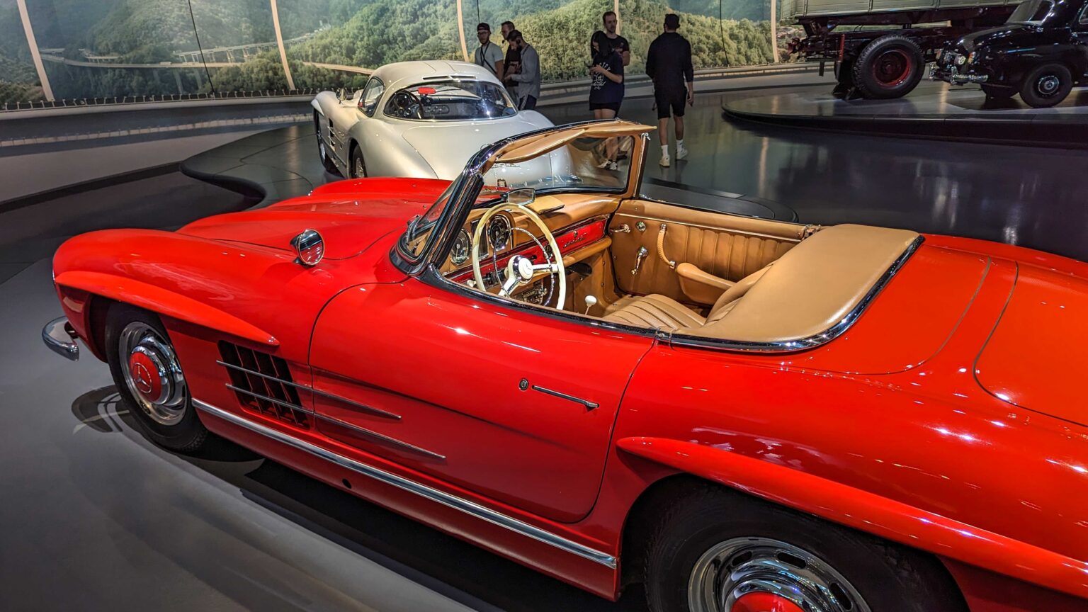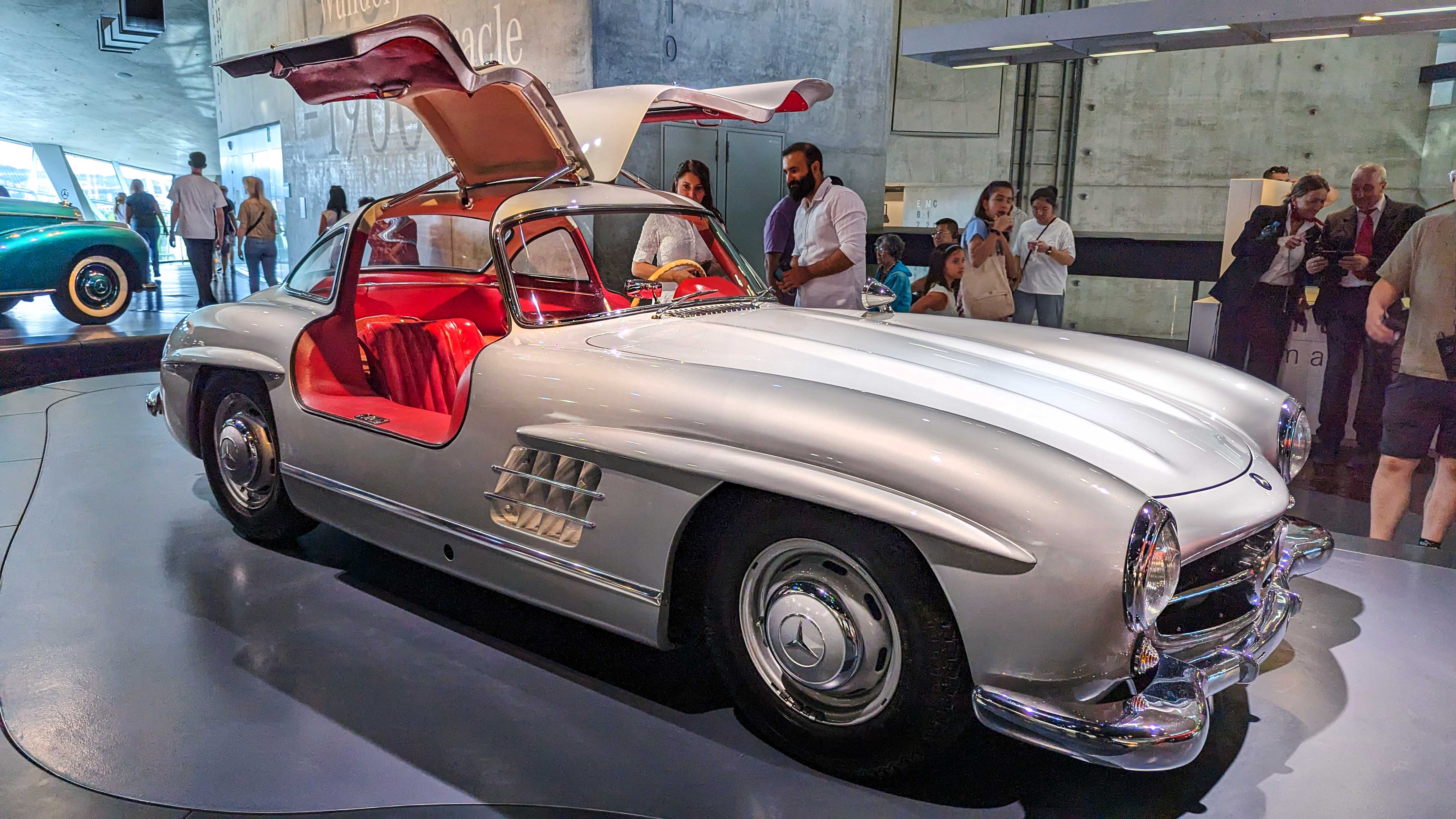 The 300 SL Gullwing (1954–1957) became an instant legend with its iconic upward-opening doors. Powered by a 3.0-liter inline-six with 215 hp, it was the fastest production car of its time and remains one of the most collectible Mercedes ever.