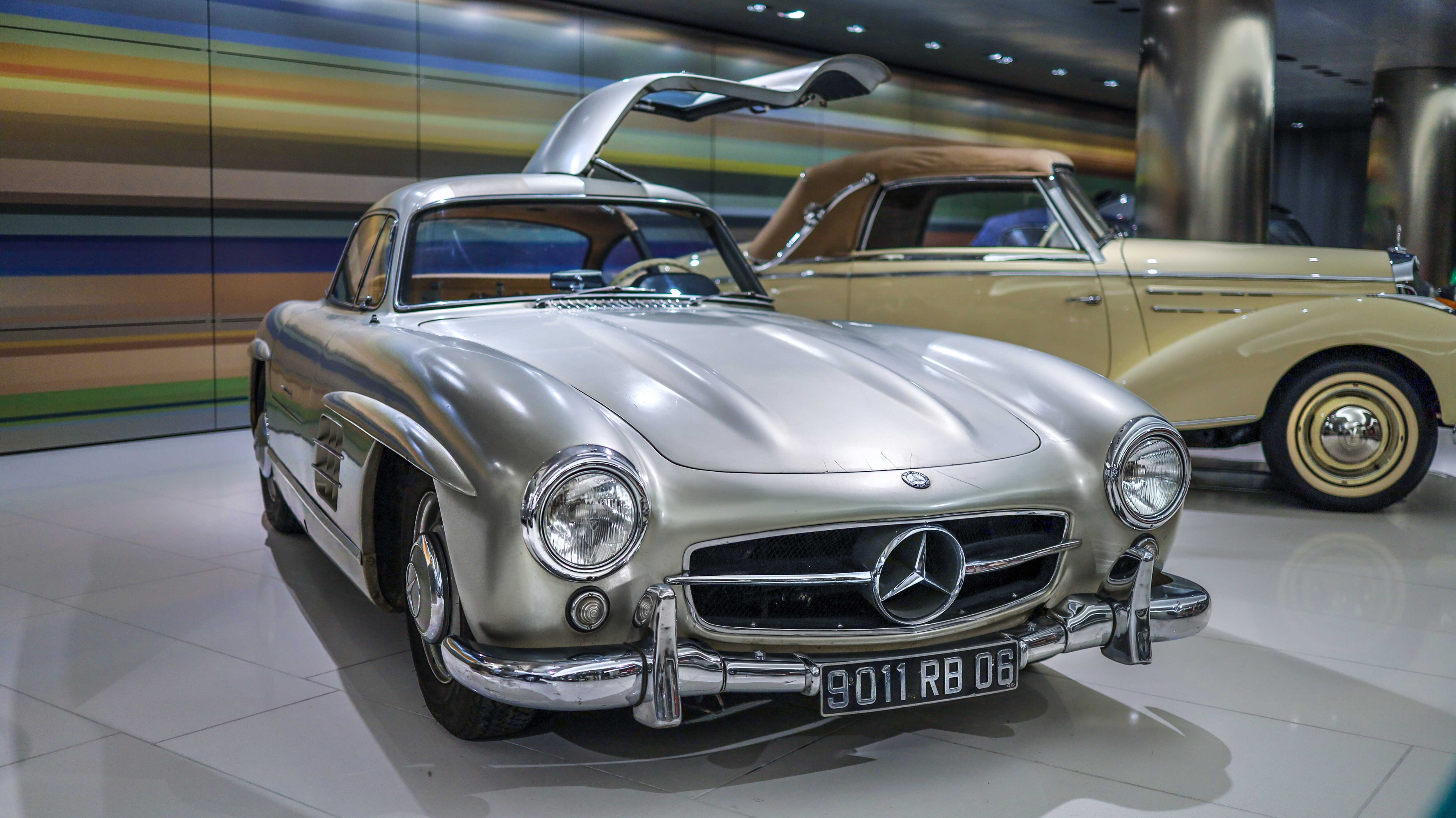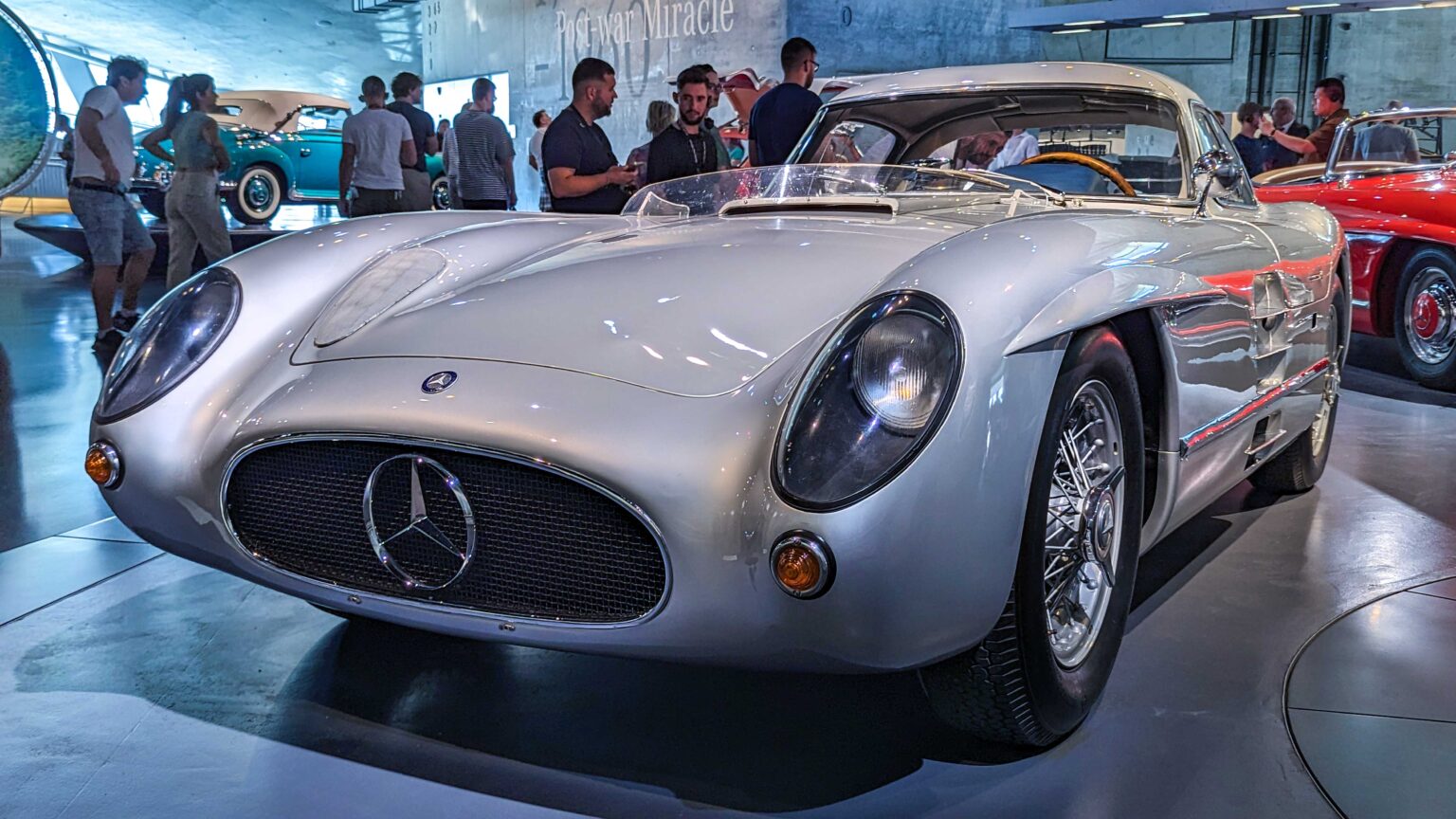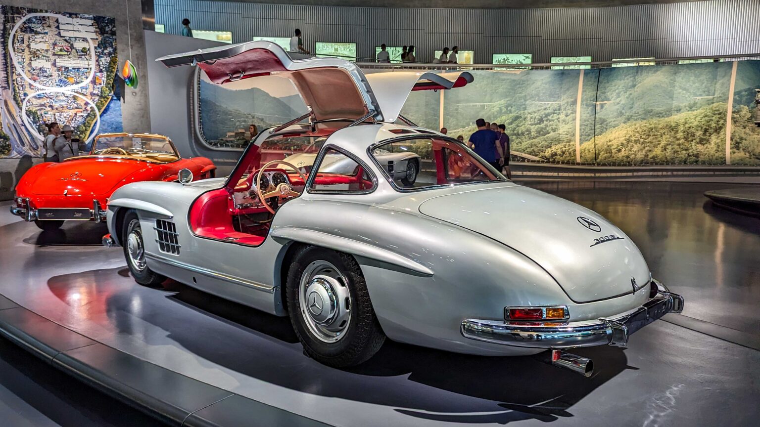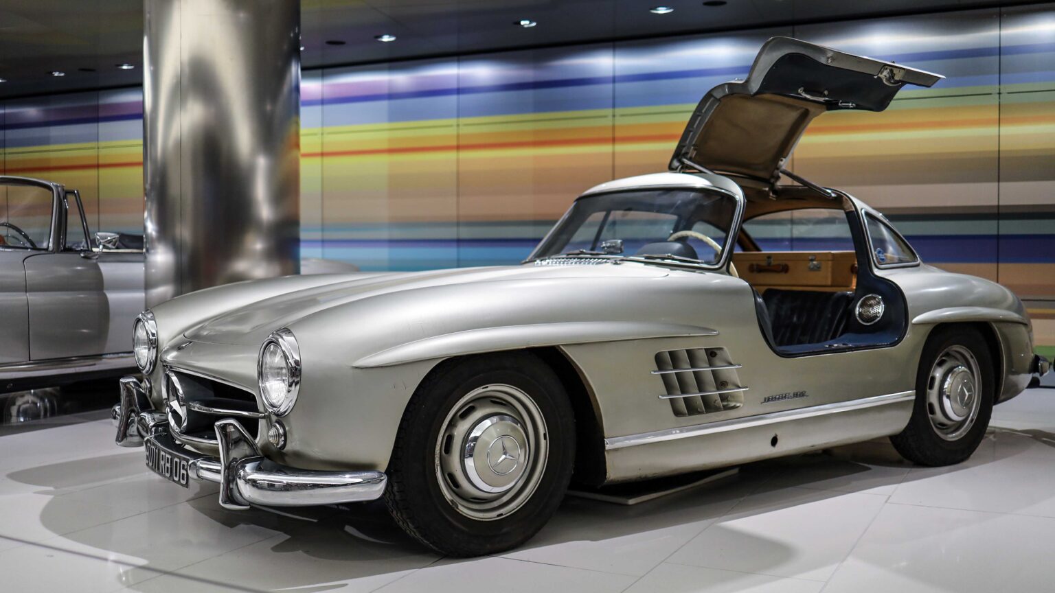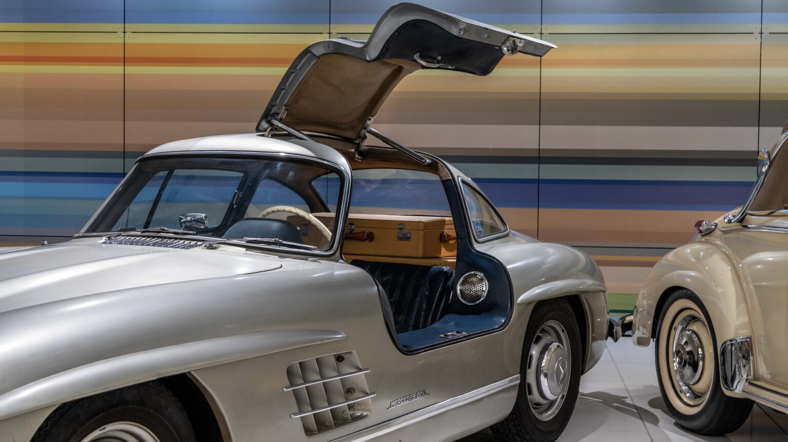 The 300 SL Gullwing (1954–1957) became an instant legend with its iconic upward-opening doors. Powered by a 3.0-liter inline-six with 215 hp, it was the fastest production car of its time and remains one of the most collectible Mercedes ever.