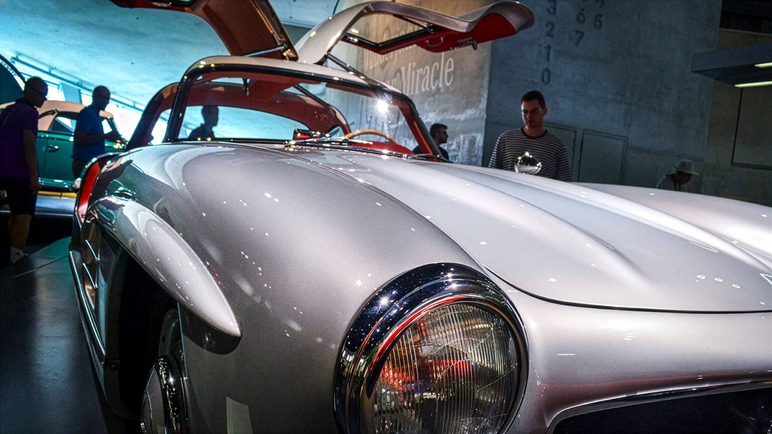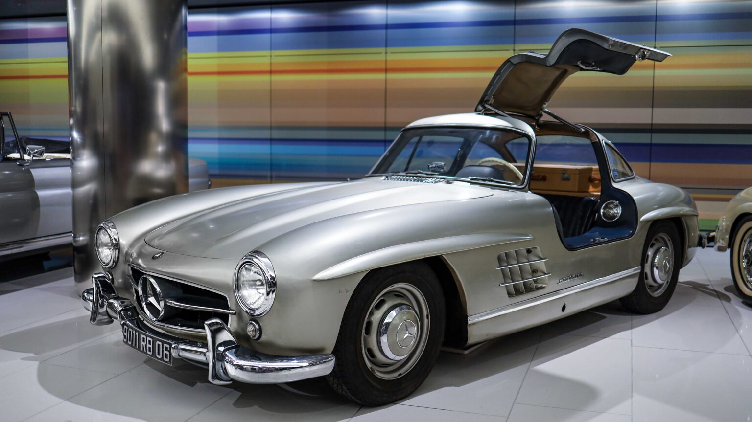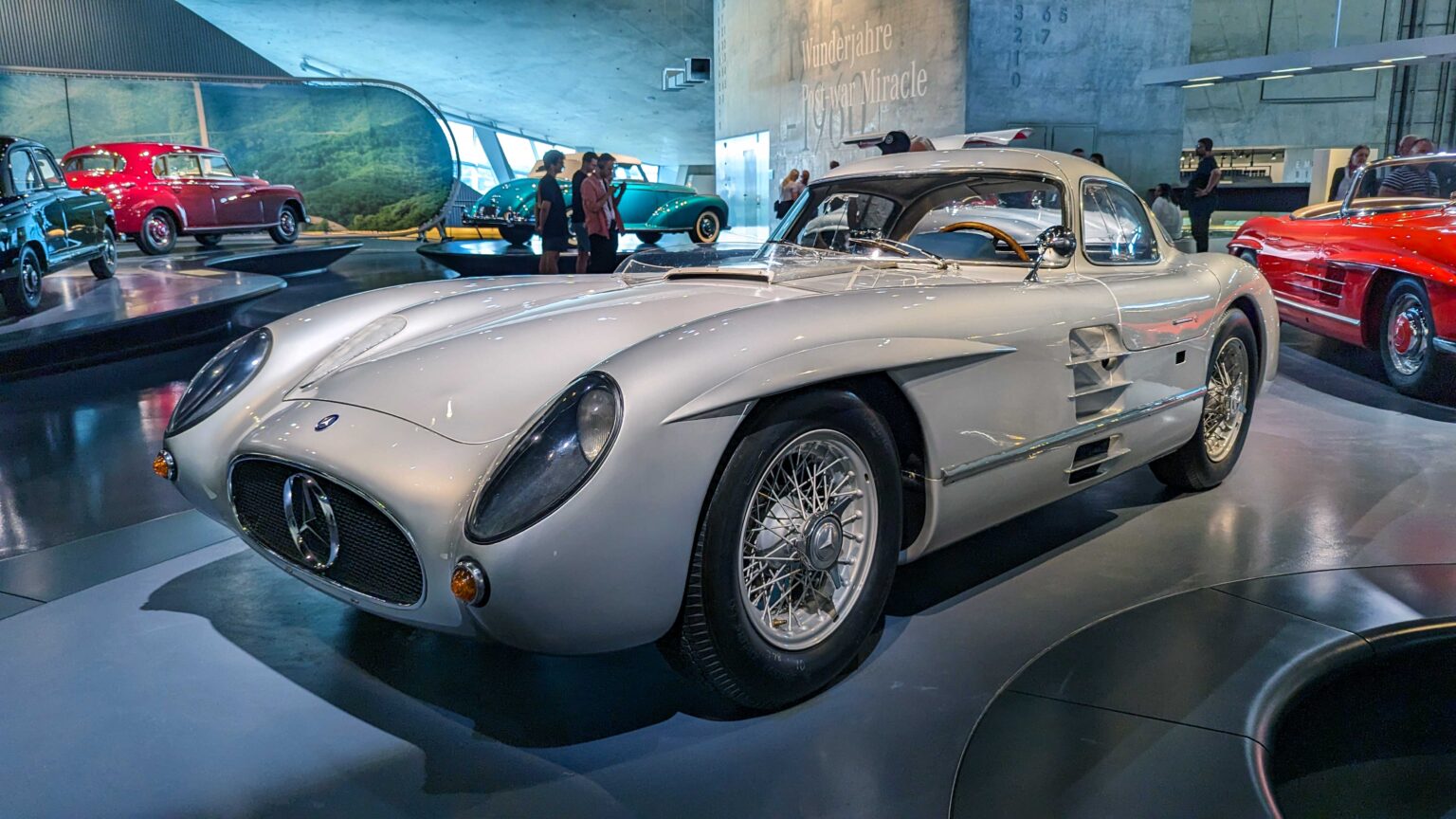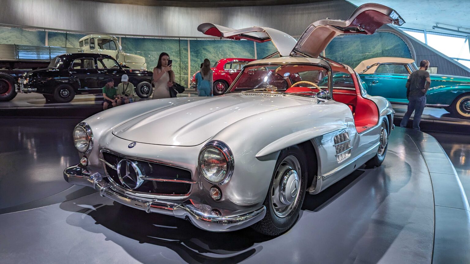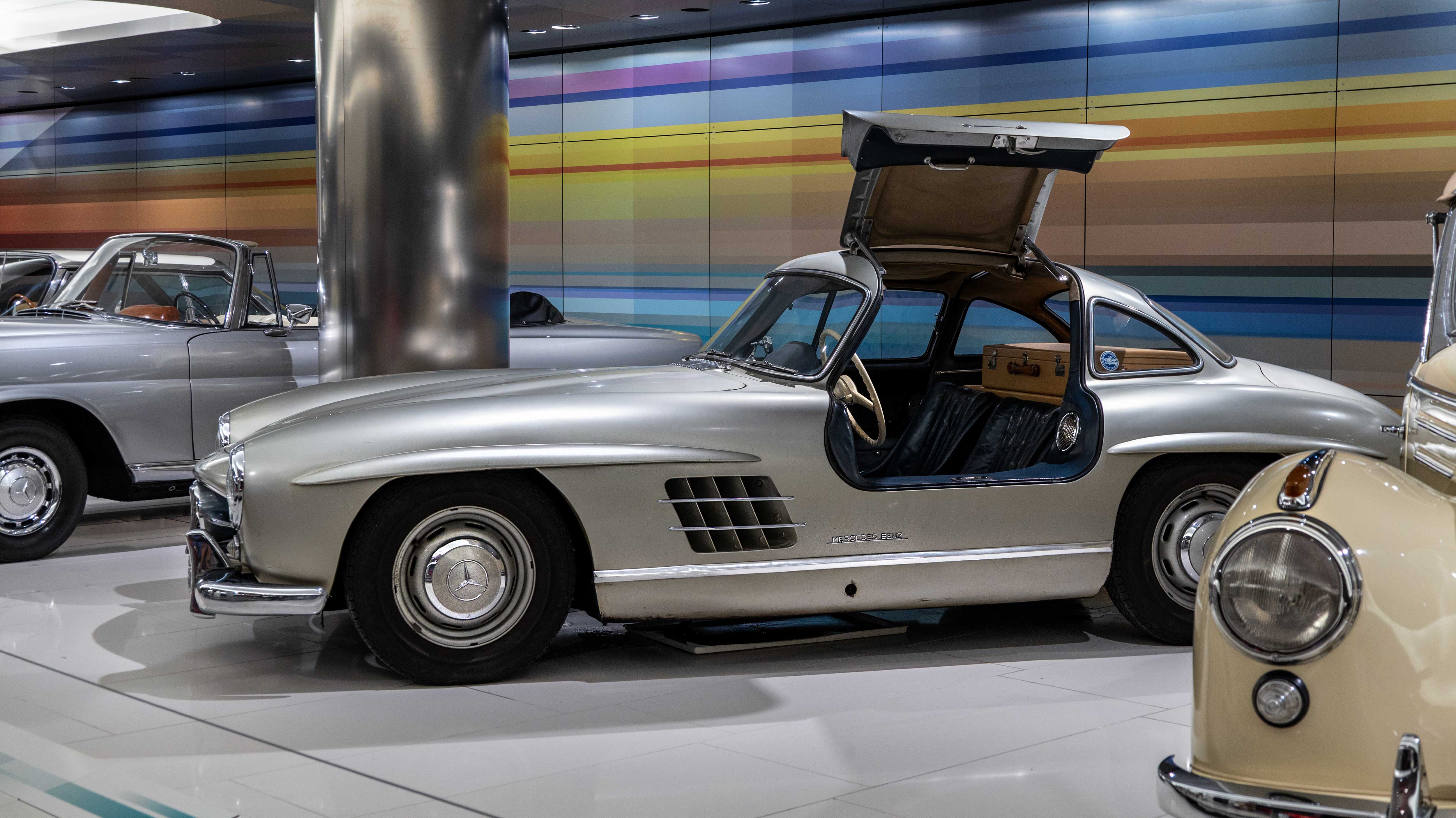 The 300 SL Gullwing (1954–1957) became an instant legend with its iconic upward-opening doors. Powered by a 3.0-liter inline-six with 215 hp, it was the fastest production car of its time and remains one of the most collectible Mercedes ever.