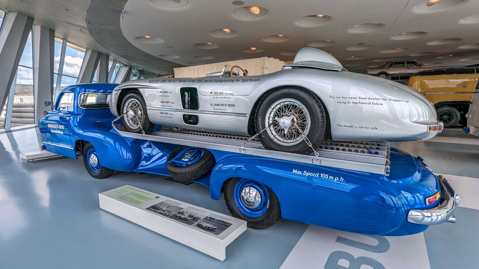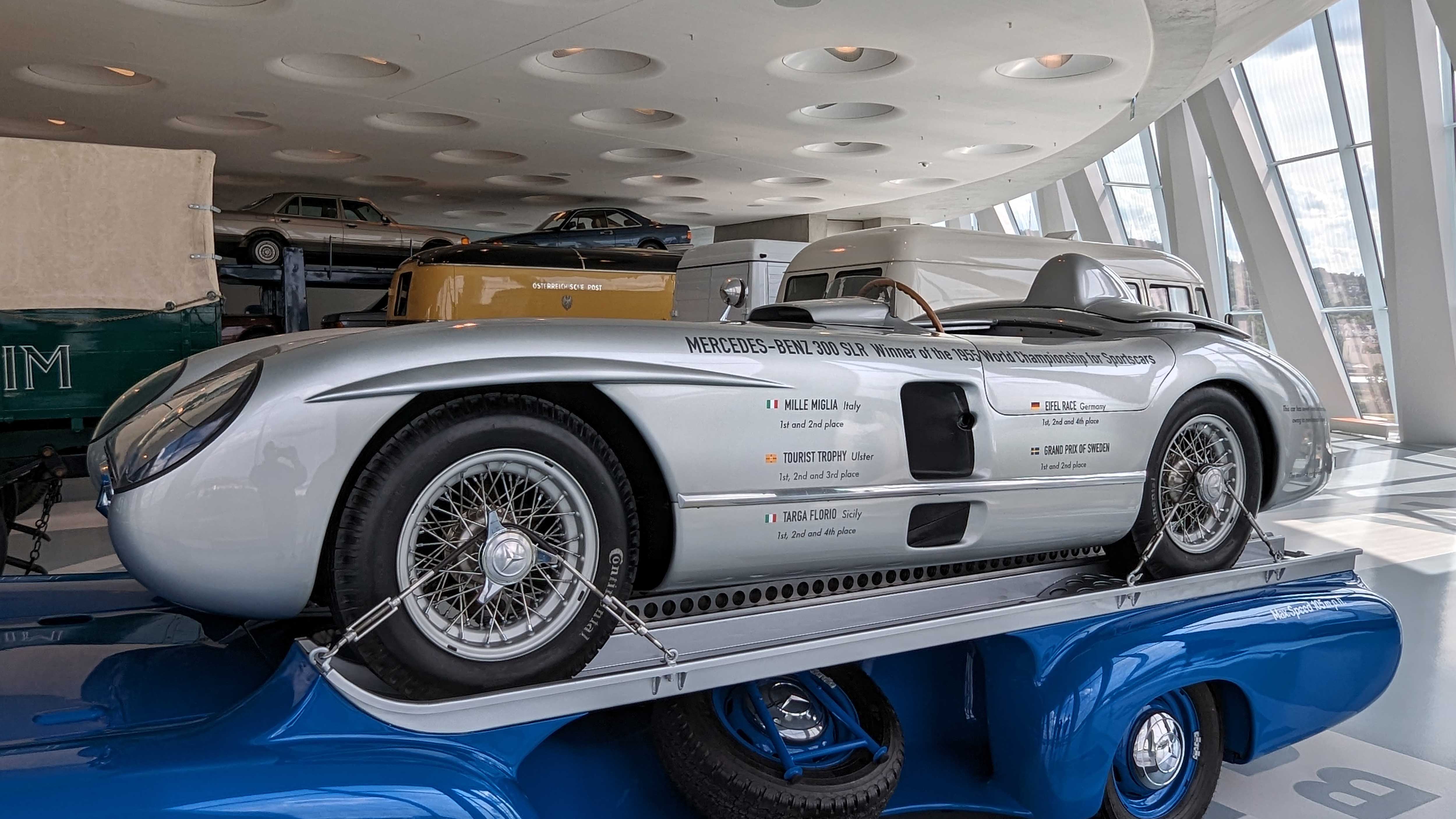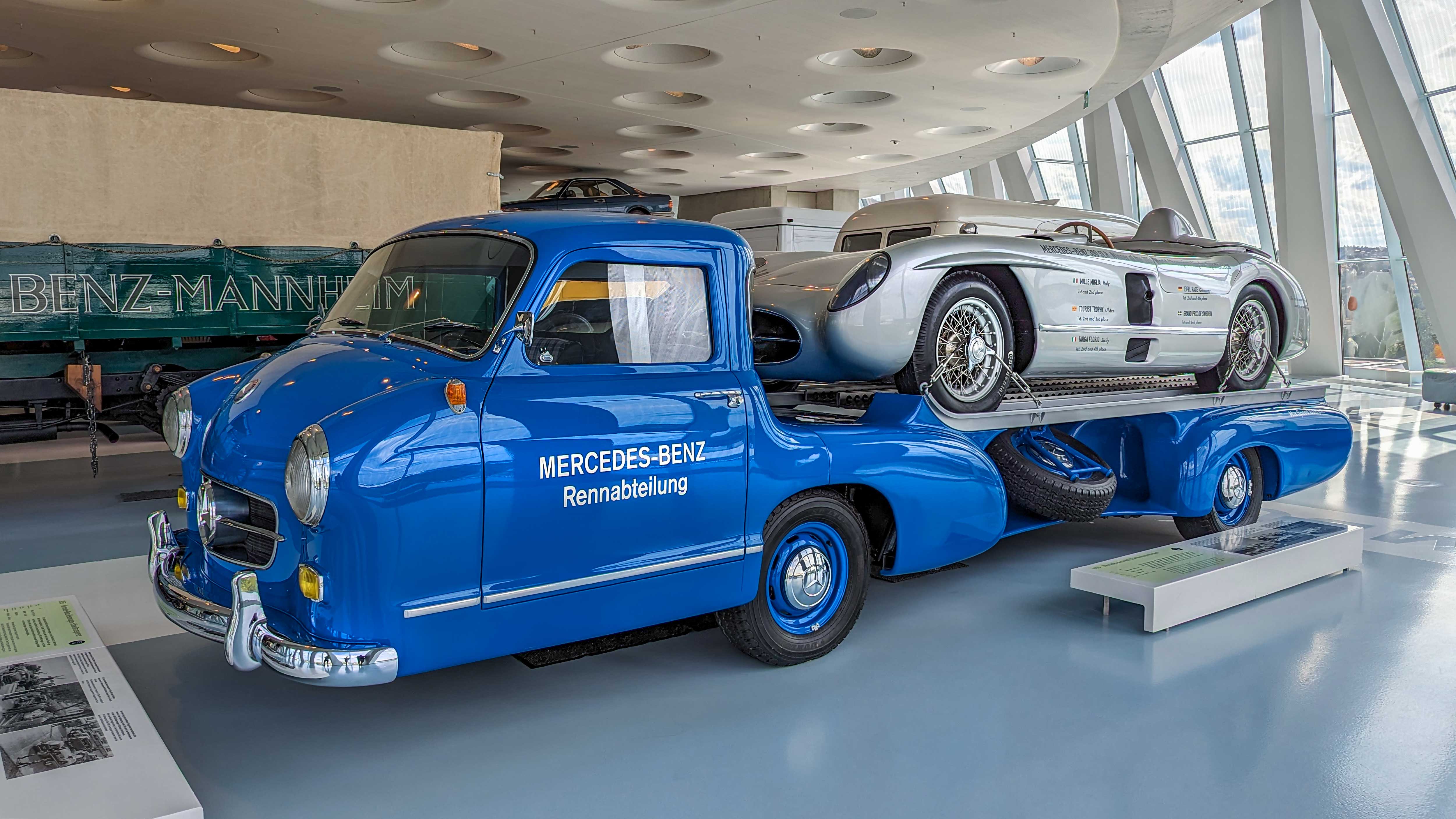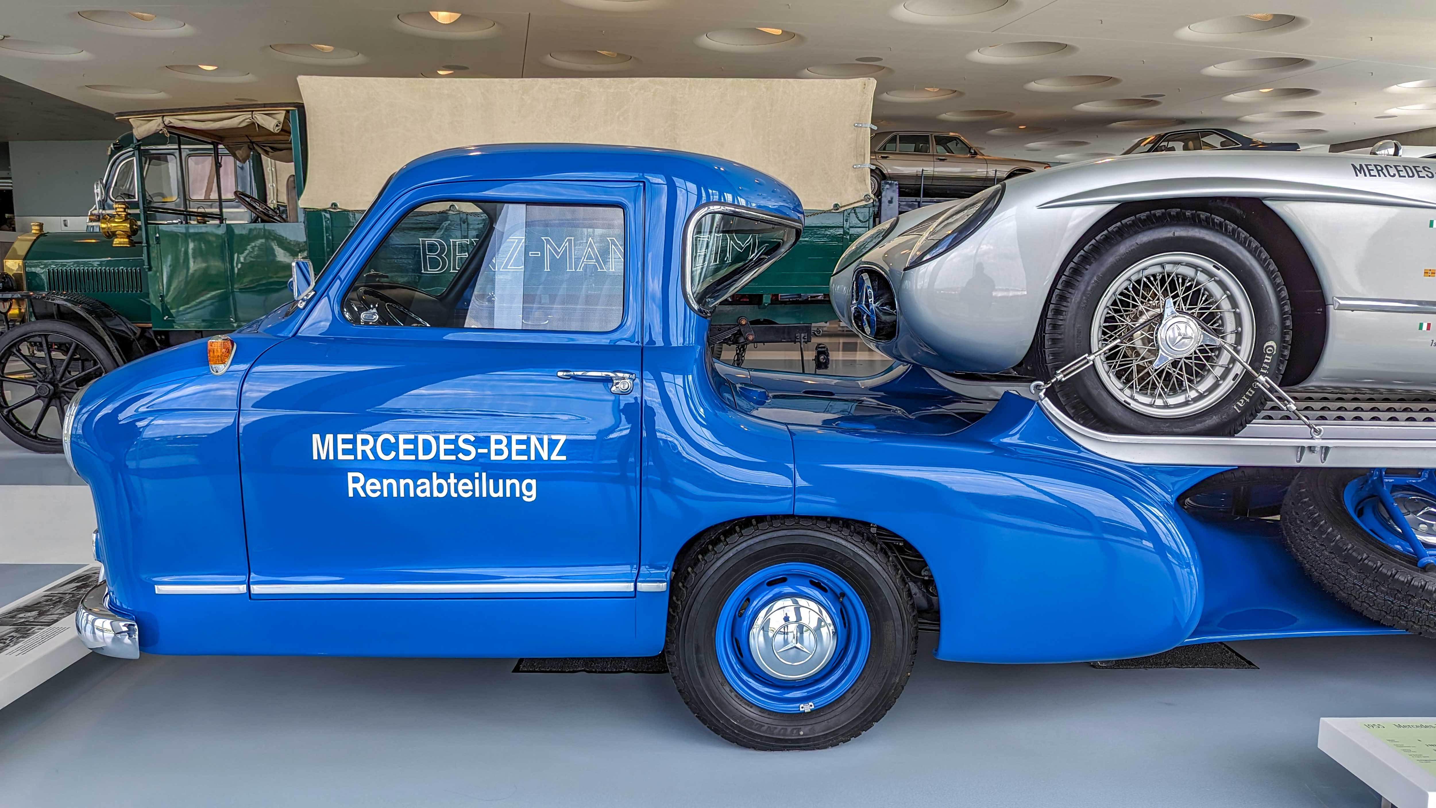 The 300 SLR (1955) became a racing legend with its 3.0-liter straight-eight engine producing 310 hp. Driven by Stirling Moss to Mille Miglia victory, it remains one of the most valuable Mercedes ever built. The Schnelltransporter, was built in 1955 to transport the 300 SLR race cars.