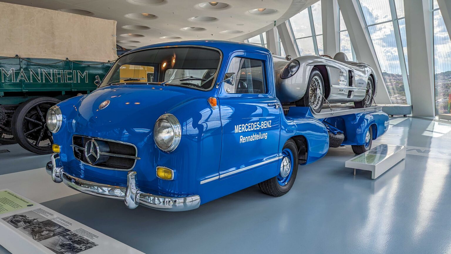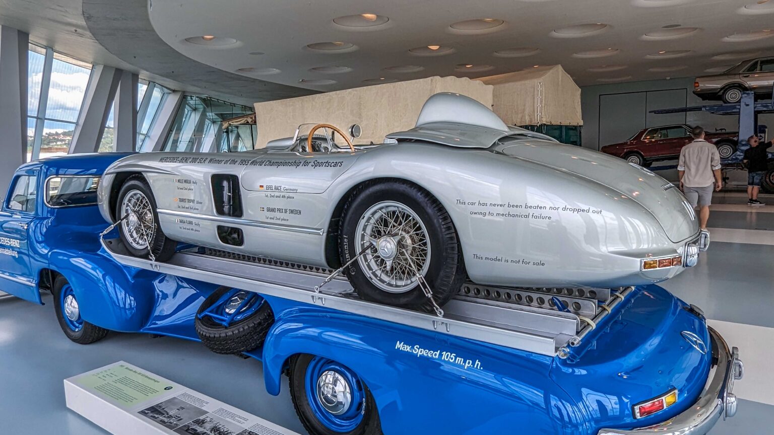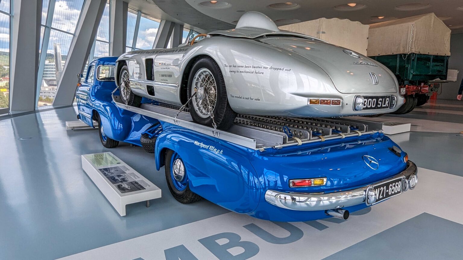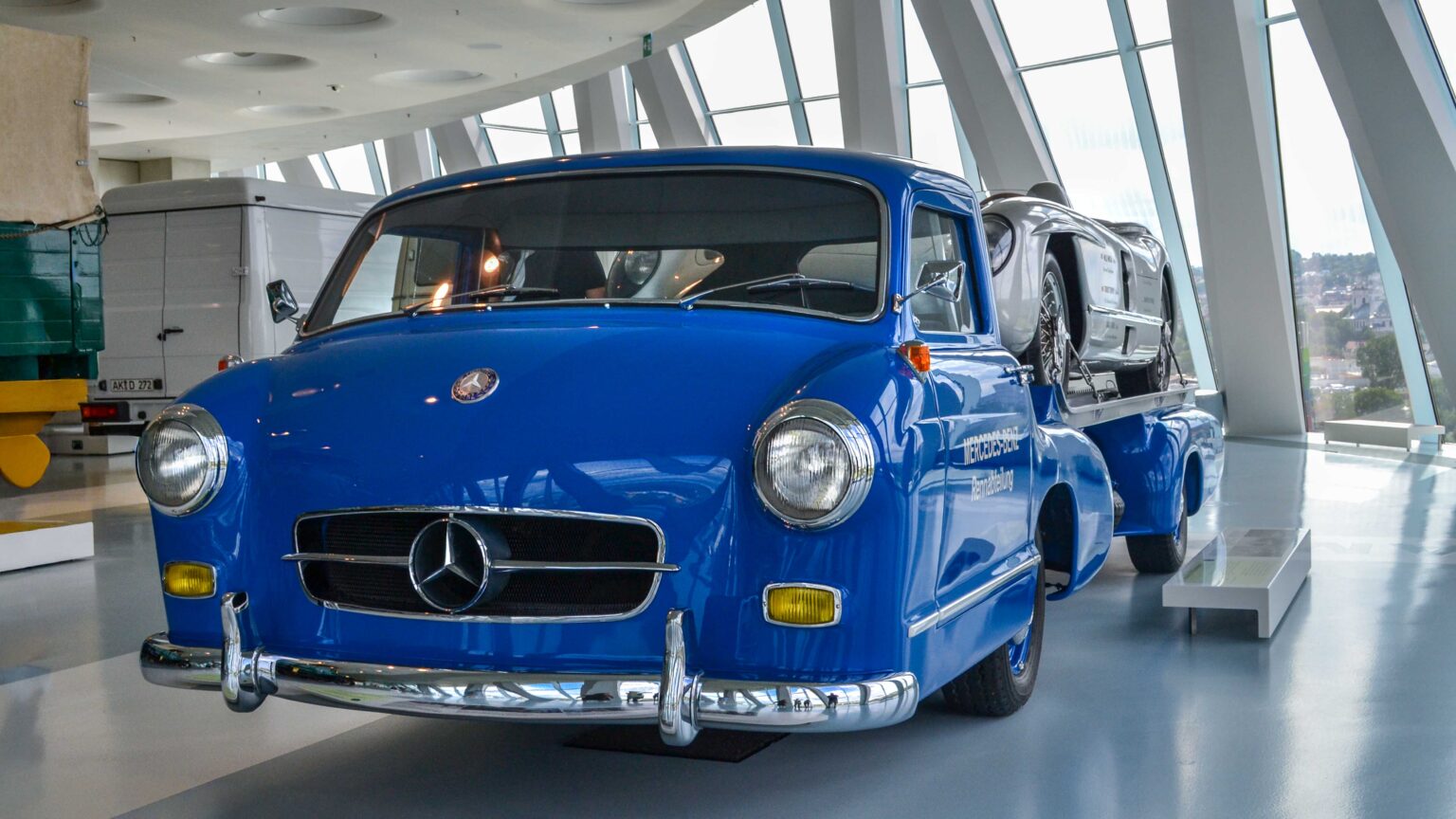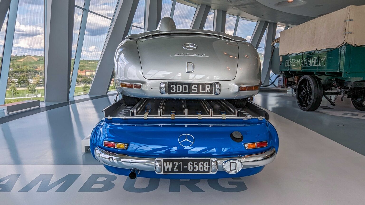 The 300 SLR (1955) became a racing legend with its 3.0-liter straight-eight engine producing 310 hp. Driven by Stirling Moss to Mille Miglia victory, it remains one of the most valuable Mercedes ever built. The Schnelltransporter, was built in 1955 to transport the 300 SLR race cars.
