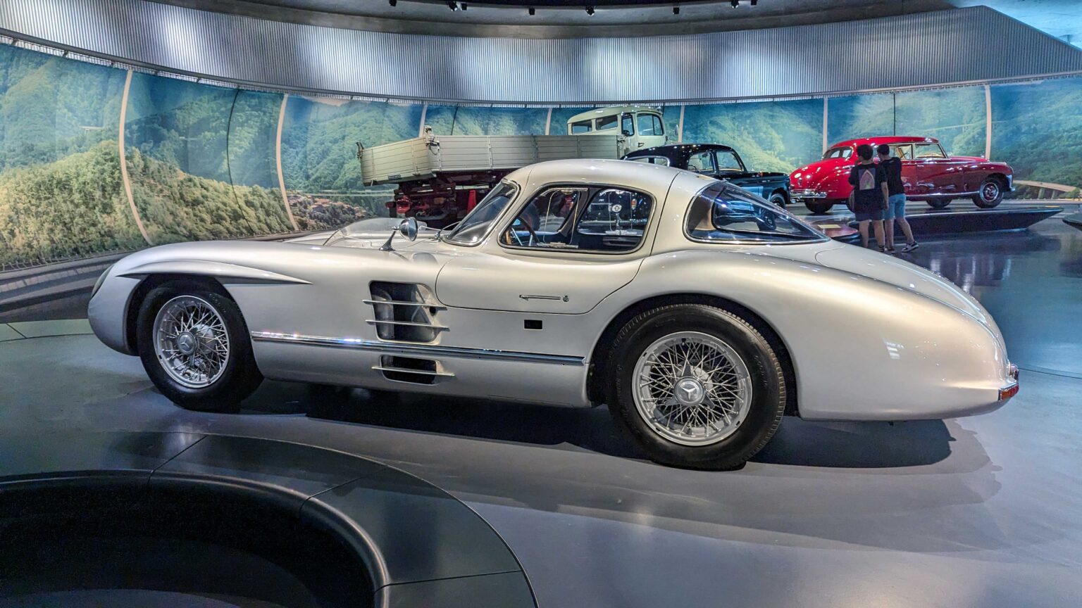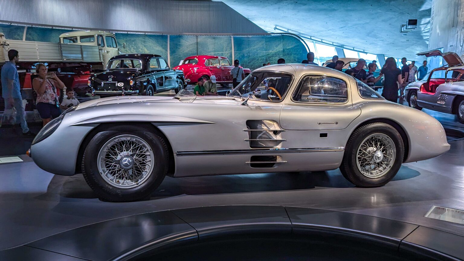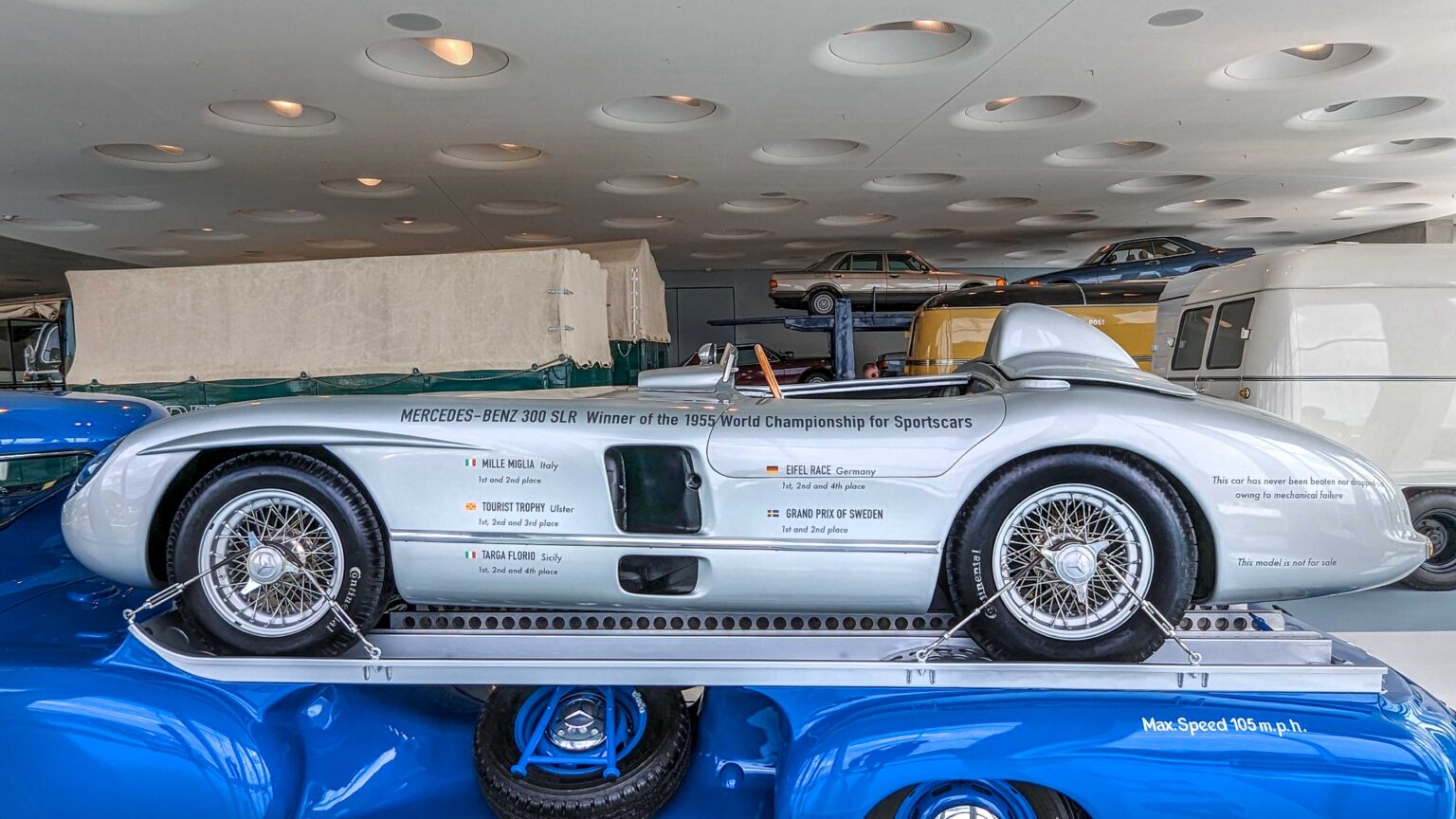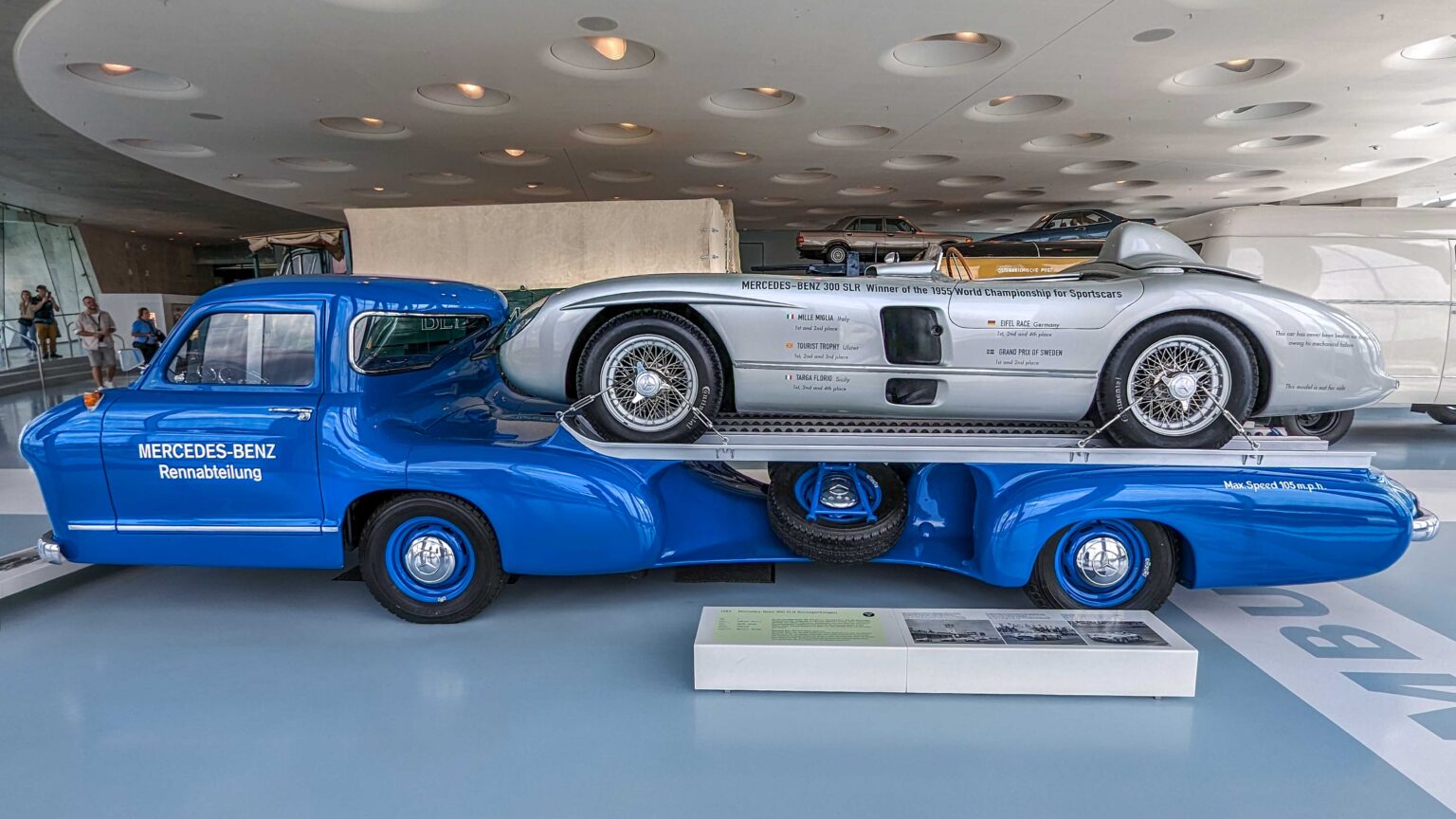 The 300 SLR (1955) became a racing legend with its 3.0-liter straight-eight engine producing 310 hp. Driven by Stirling Moss to Mille Miglia victory, it remains one of the most valuable Mercedes ever built. The Schnelltransporter, was built in 1955 to transport the 300 SLR race cars.