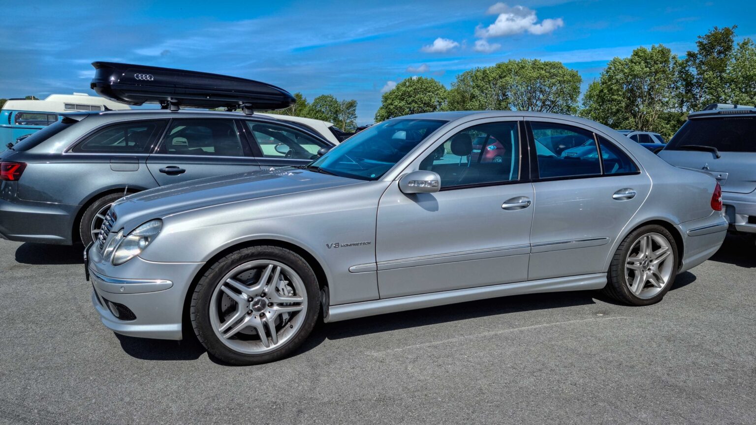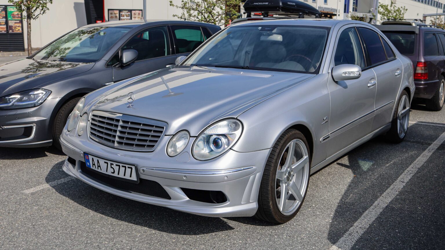 The E-Class W211 (2002–2009) mixed elegance with new safety tech like Pre-Safe. Performance peaked with the AMG E55 at 476 hp and later the AMG E63 with 514 hp.